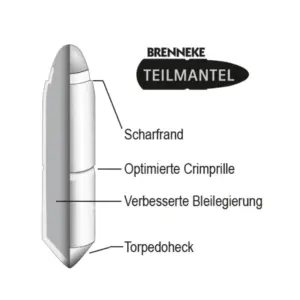 Os projéteis de desmontagem parcial são projetados de tal forma que podem ser desmontados de forma controlada, exceto por um corpo residual. Isto significa: descarga máxima de energia e efeito de morte rápido, adaptado ao tamanho do animal, por libertação de lascas. Em conjunto com o rebordo afiado inventado pela BRENNEKE, os sinais de sangue serão evidentes mesmo que o animal tenha percorrido uma longa distância em fuga.