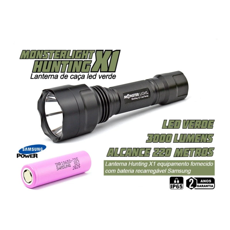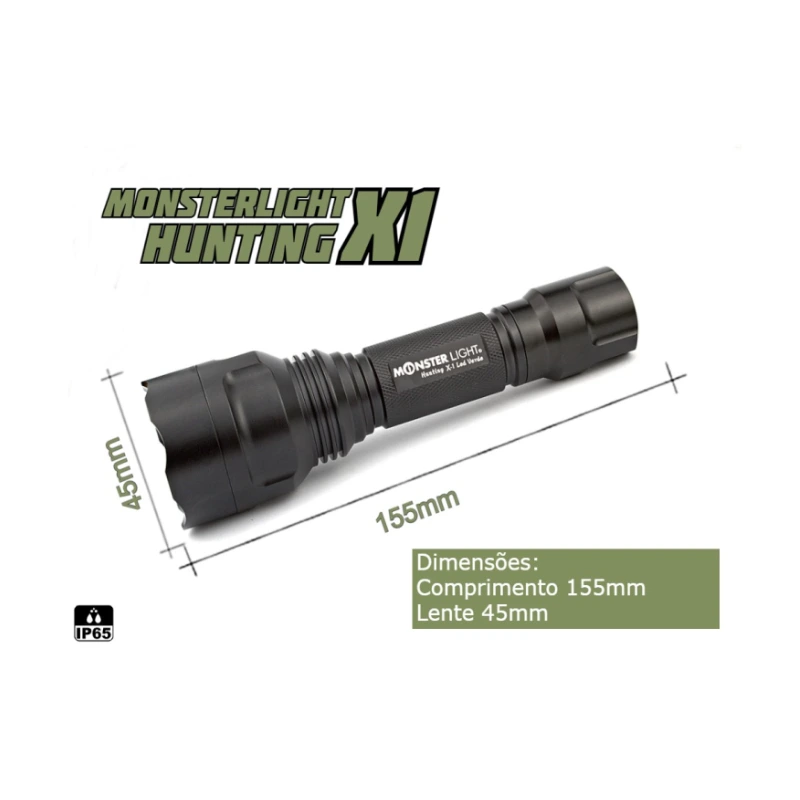 Kit lanterna para esperas MonsterLight Hunting X-1 led verde. Este kit está equipado com tudo o que precisa para montar na sua arma. Esta lanterna foi desenvolvida para atividades de caça ou localização de animais. Lanterna de led verde que é invisível aos olhos do animal, de foco, redondo e concentrado, para projeção de longas distâncias. Só com 1 modo forte. Equipamento fornecido com bateria Samsung, que garante a melhor performance e autonomia.